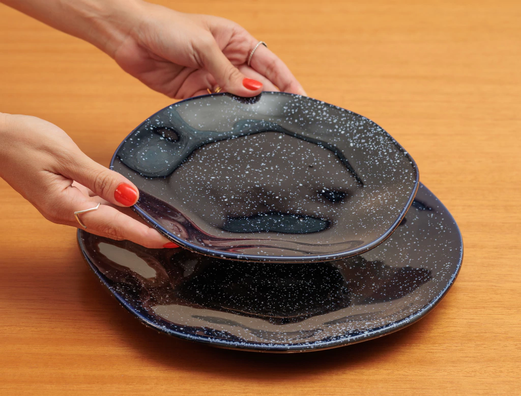 As peças em formato orgânico valorizam a beleza do imperfeito. Estas peças foram feitas com esmalte reagente, garantindo que cada peça seja única e especial.