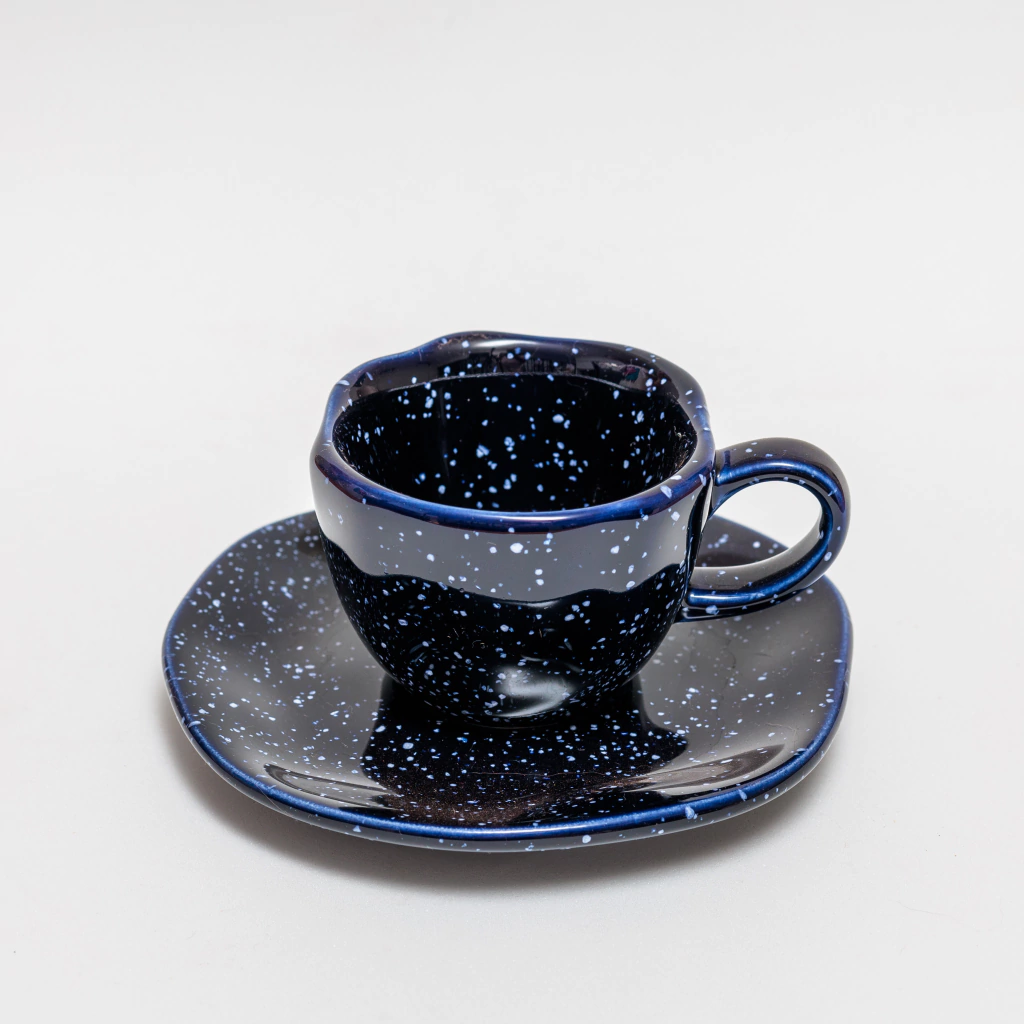 Xícara de café azul marinho, da linha Noite Estrelada, em porcelana. Sua cor e desenho lembram um céu azul estrelado, perfeita para chá e café.